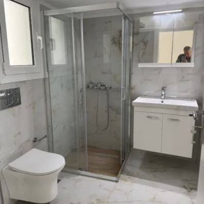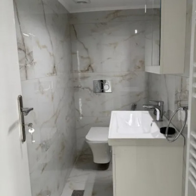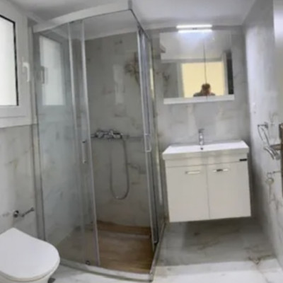 Ένα μπάνιο με ντουζιέρα και παροχές για πλυντήριο και ένα WC.