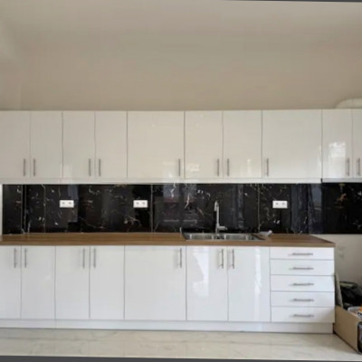 Ενιαίος χώρος κουζίνας- τραπεζαρίας- καθιστικού. Ντουλάπια κουζίνας καινούρια.